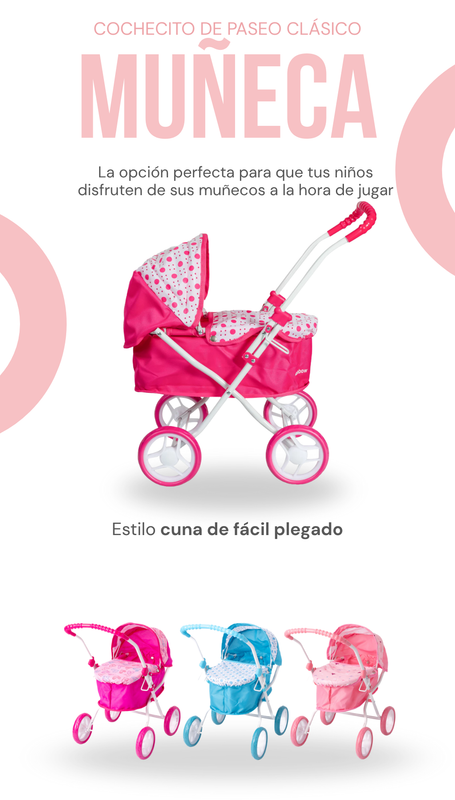 Este cochecito estilo cuna es el compañero ideal para que los más pequeños integren a sus muñecos favoritos en sus rutinas de juego. Con un diseño clásico y funcional, ofrece una estructura resistente y liviana, pensada para facilitar el movimiento y estimular el desarrollo afectivo a través del juego simbólico.