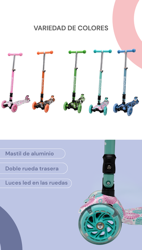 Ruedas con Luces LED: Incluye iluminación en las ruedas delanteras que se activa con el movimiento por fricción, eliminando el uso de pilas.