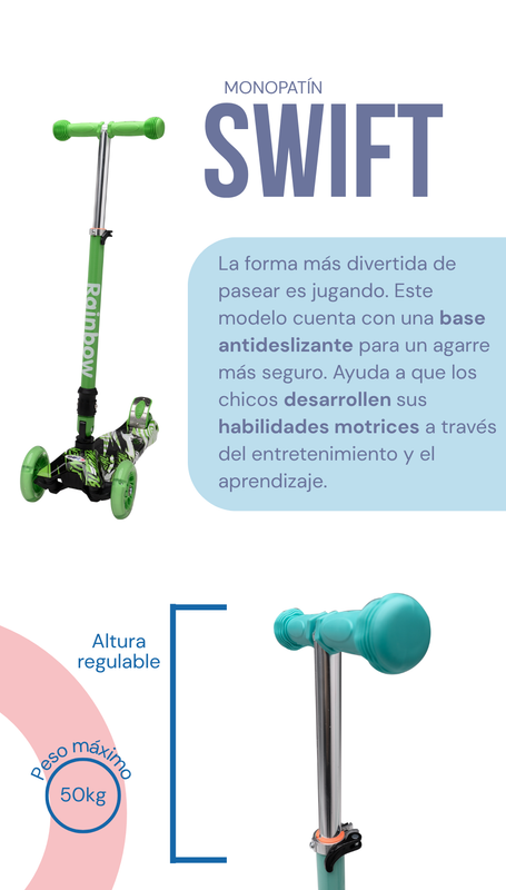 El modelo Swift es la opción perfecta para quienes buscan un equilibrio entre diseño y funcionalidad. Gracias a su sistema Learn to Steer, el niño controla el giro inclinando su cuerpo, lo que facilita el aprendizaje del equilibrio. A diferencia de otros modelos, el Swift es plegable, lo que permite guardarlo en espacios pequeños o transportarlo cómodamente de forma compacta.