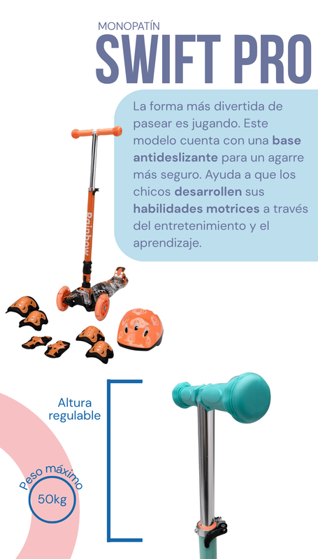 El Swift Pro es la solución integral para quienes buscan un primer monopatín seguro y duradero. Su principal diferencial es el sistema Learn to Steer (aprender a conducir), una tecnología que permite al niño maniobrar de forma intuitiva inclinando su cuerpo hacia los lados. Este sistema reemplaza el giro de manubrio tradicional, brindando muchísima más estabilidad y evitando los giros bruscos que suelen causar caídas en los principiantes.
